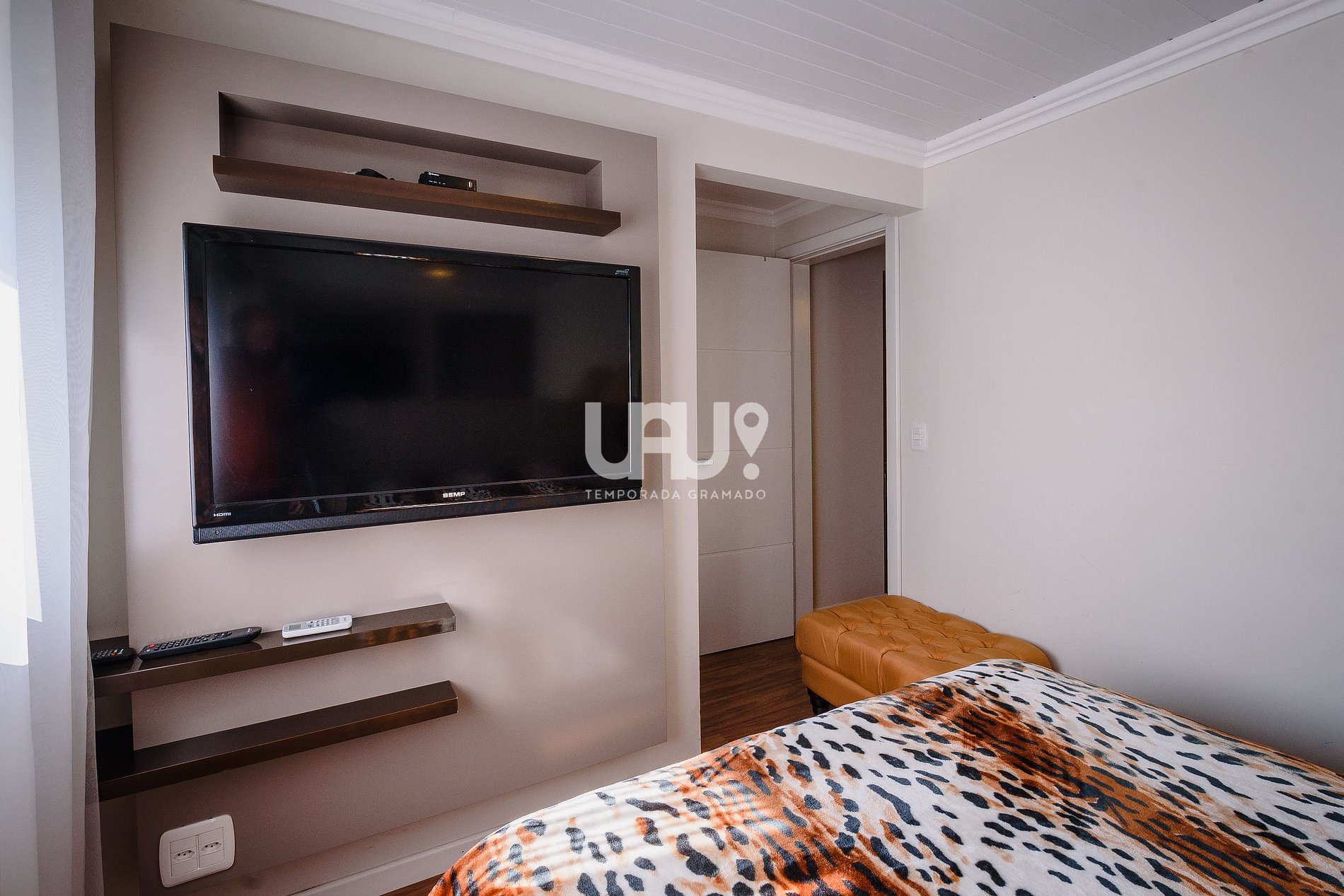 Suíte com cama Queen Size, Um puff que se transformam em cama de solteiro, rouparia completa e split q/f; Banho completo;