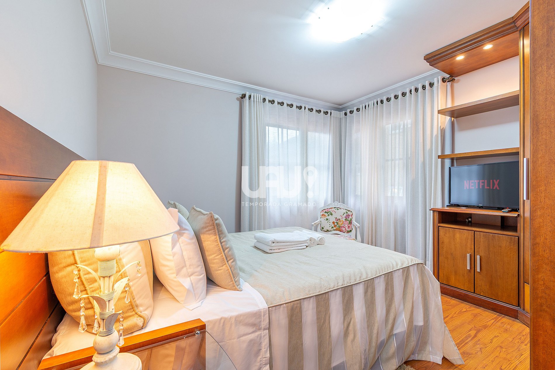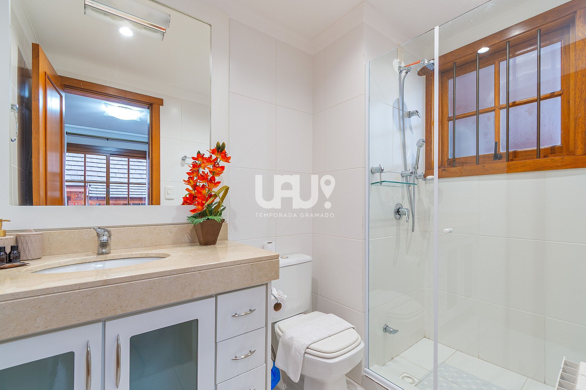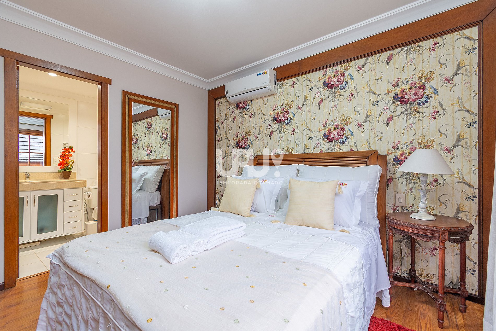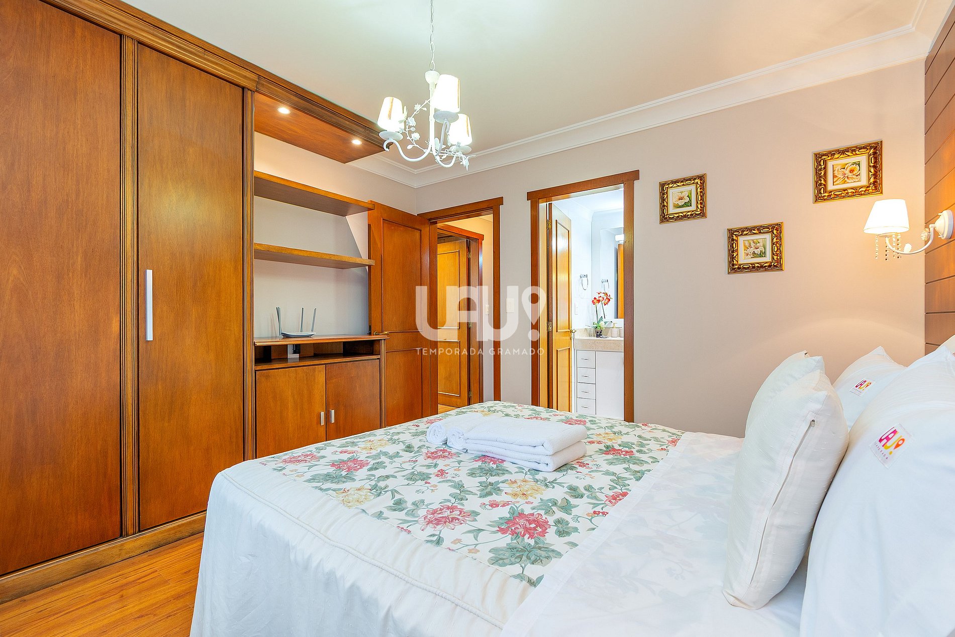 Desse modo, oferecemos acomodações confortáveis para até 16 pessoas, distribuídas em quatro confortáveis suítes, sala de estar em dois ambientes, com lareira, ar condicionado quente e frio e SmartTV 50', varanda com vista para o centro da cidade, sala de jantar para 12 pessoas, bancada alta próxima à churrasqueira, SmartTV 50', ar condicionado quente e frio, anexa à cozinha totalmente equipada, inclusive com churrasqueira a carvão.