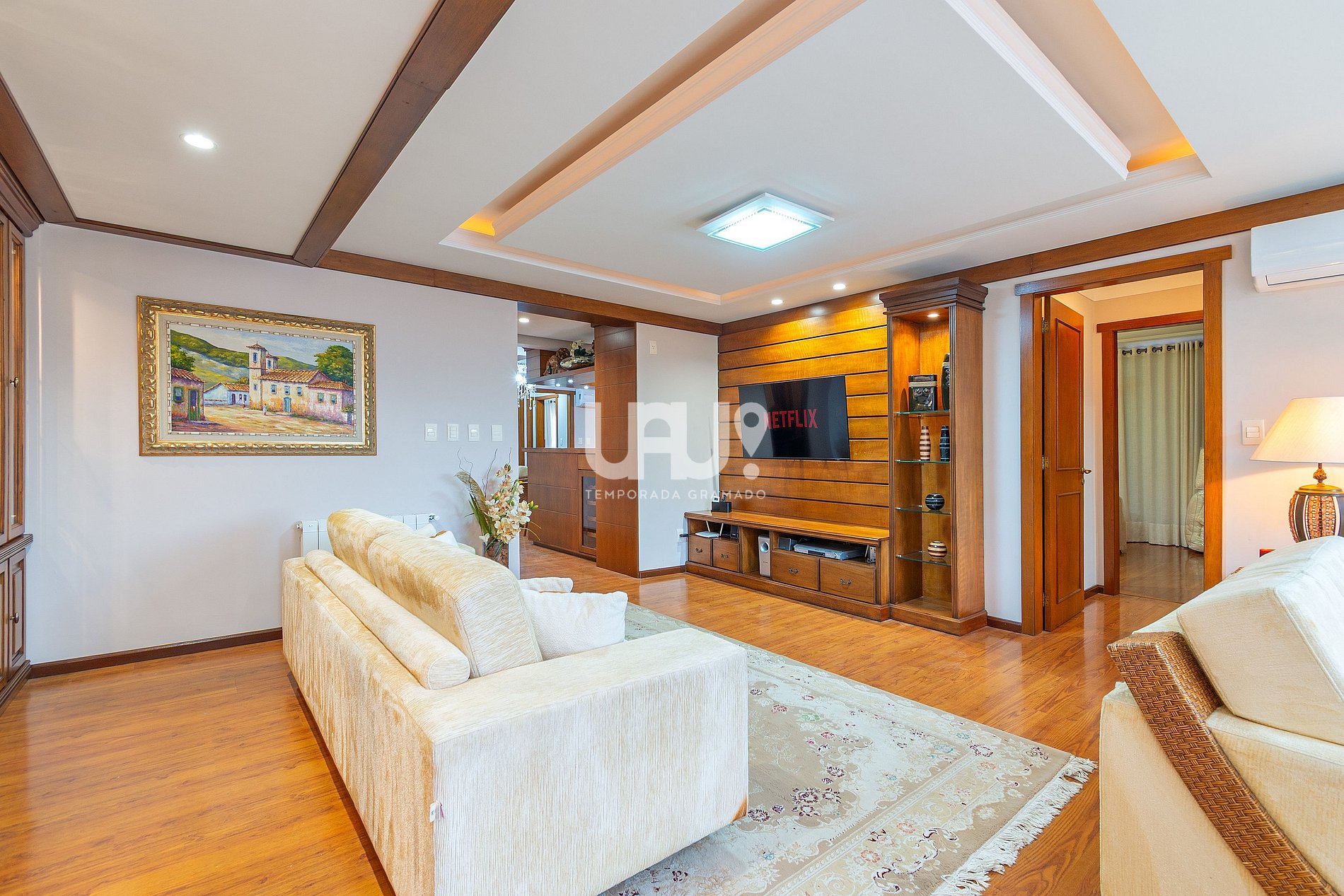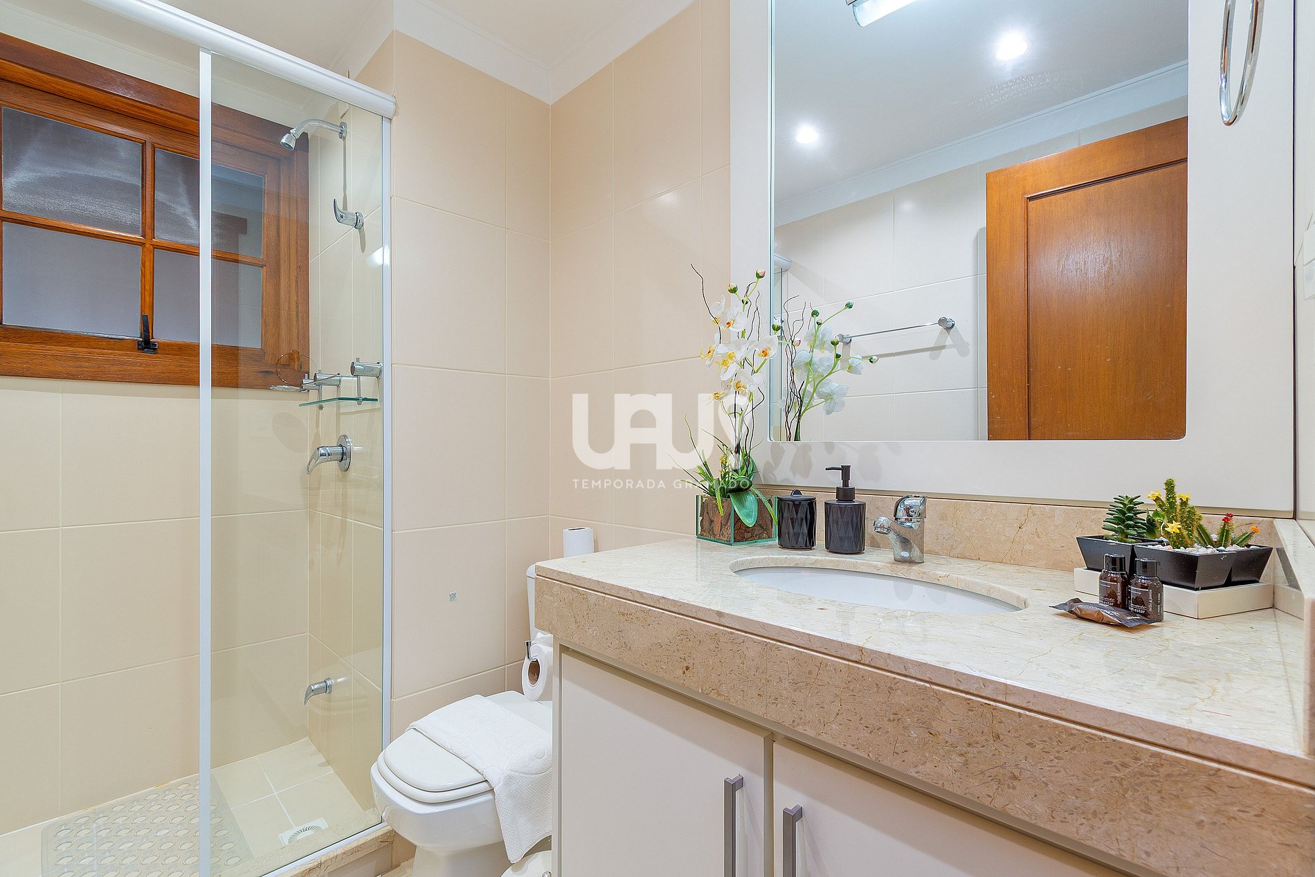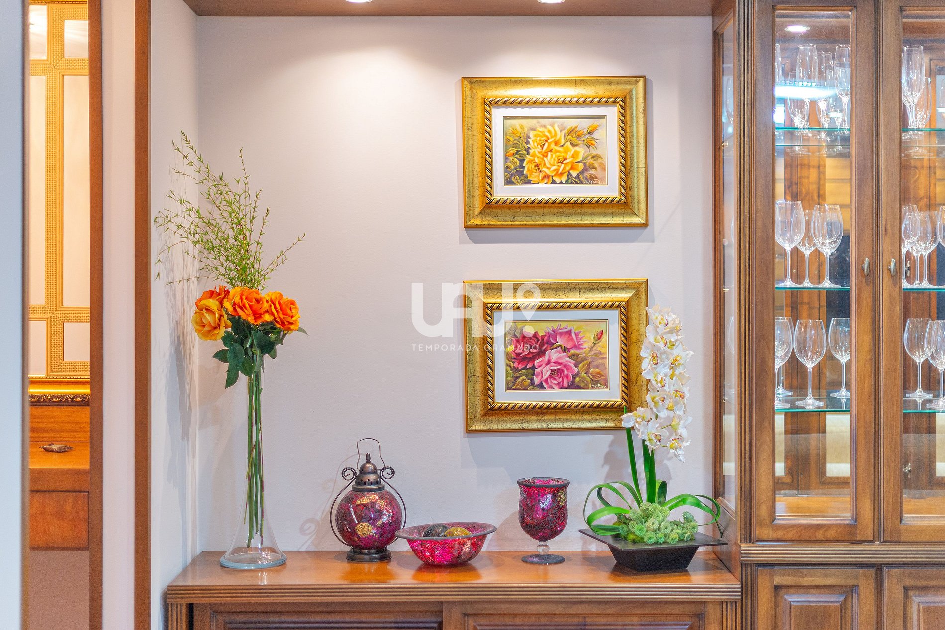 Desse modo, oferecemos acomodações confortáveis para até 16 pessoas, distribuídas em quatro confortáveis suítes, sala de estar em dois ambientes, com lareira, ar condicionado quente e frio e SmartTV 50', varanda com vista para o centro da cidade, sala de jantar para 12 pessoas, bancada alta próxima à churrasqueira, SmartTV 50', ar condicionado quente e frio, anexa à cozinha totalmente equipada, inclusive com churrasqueira a carvão.