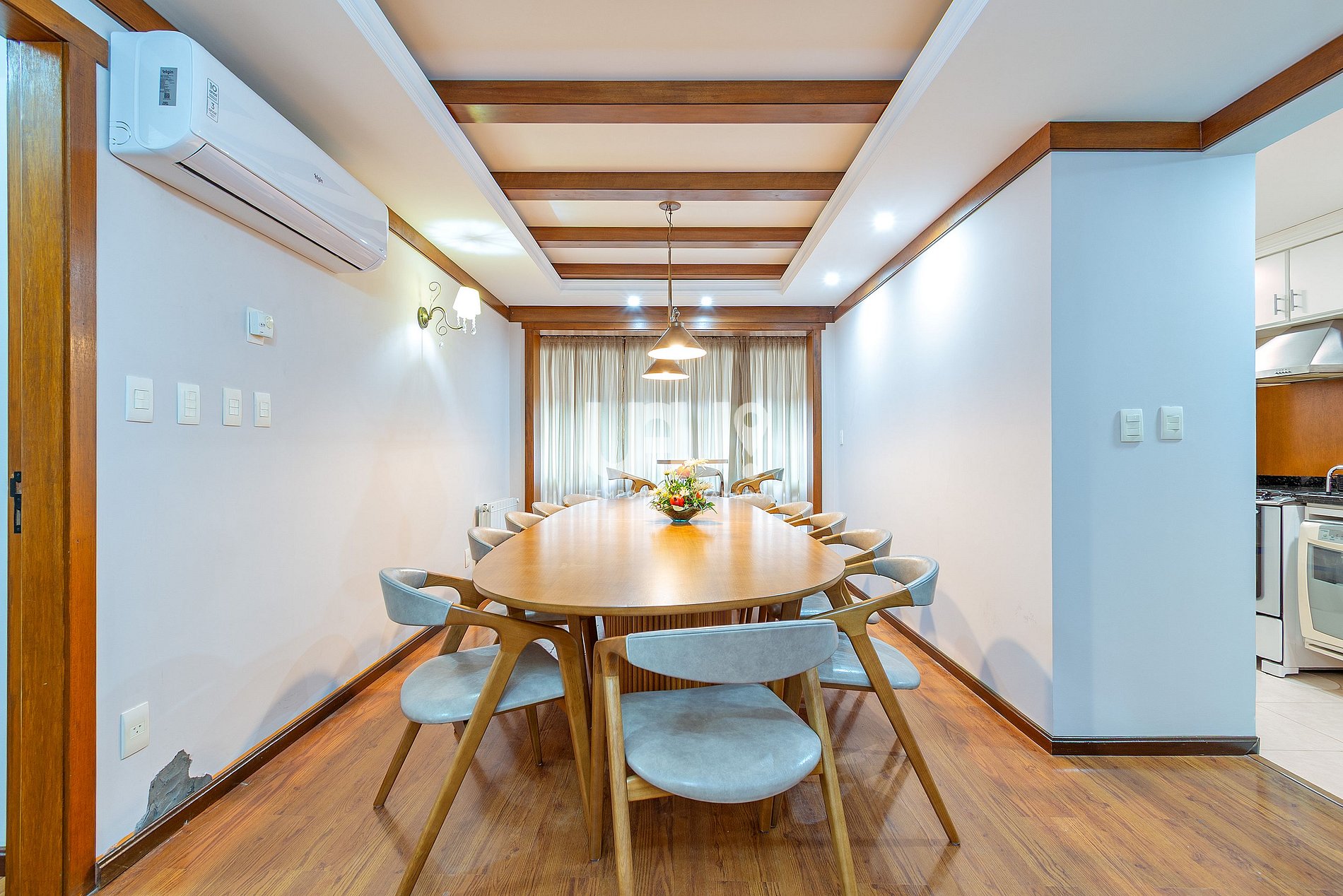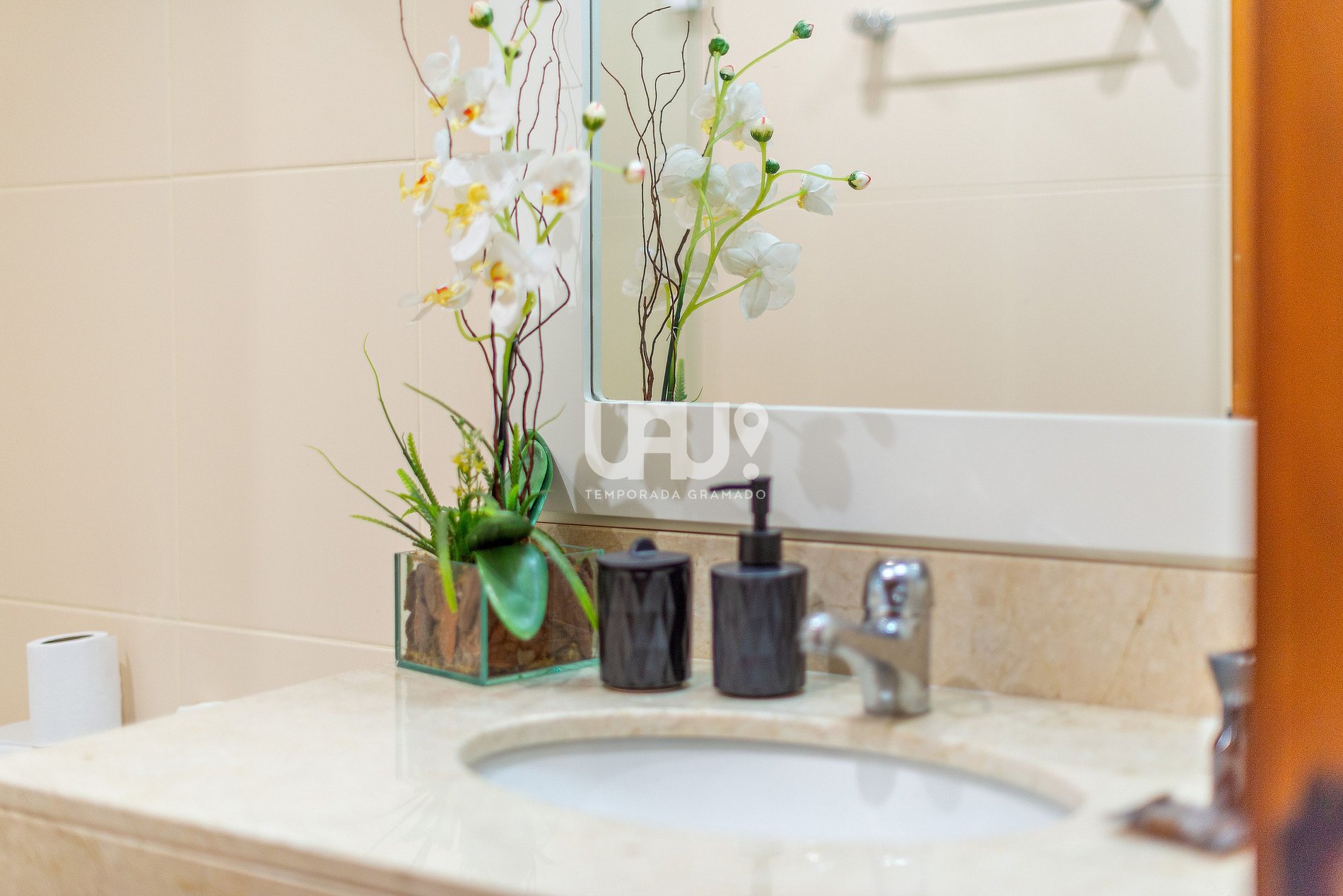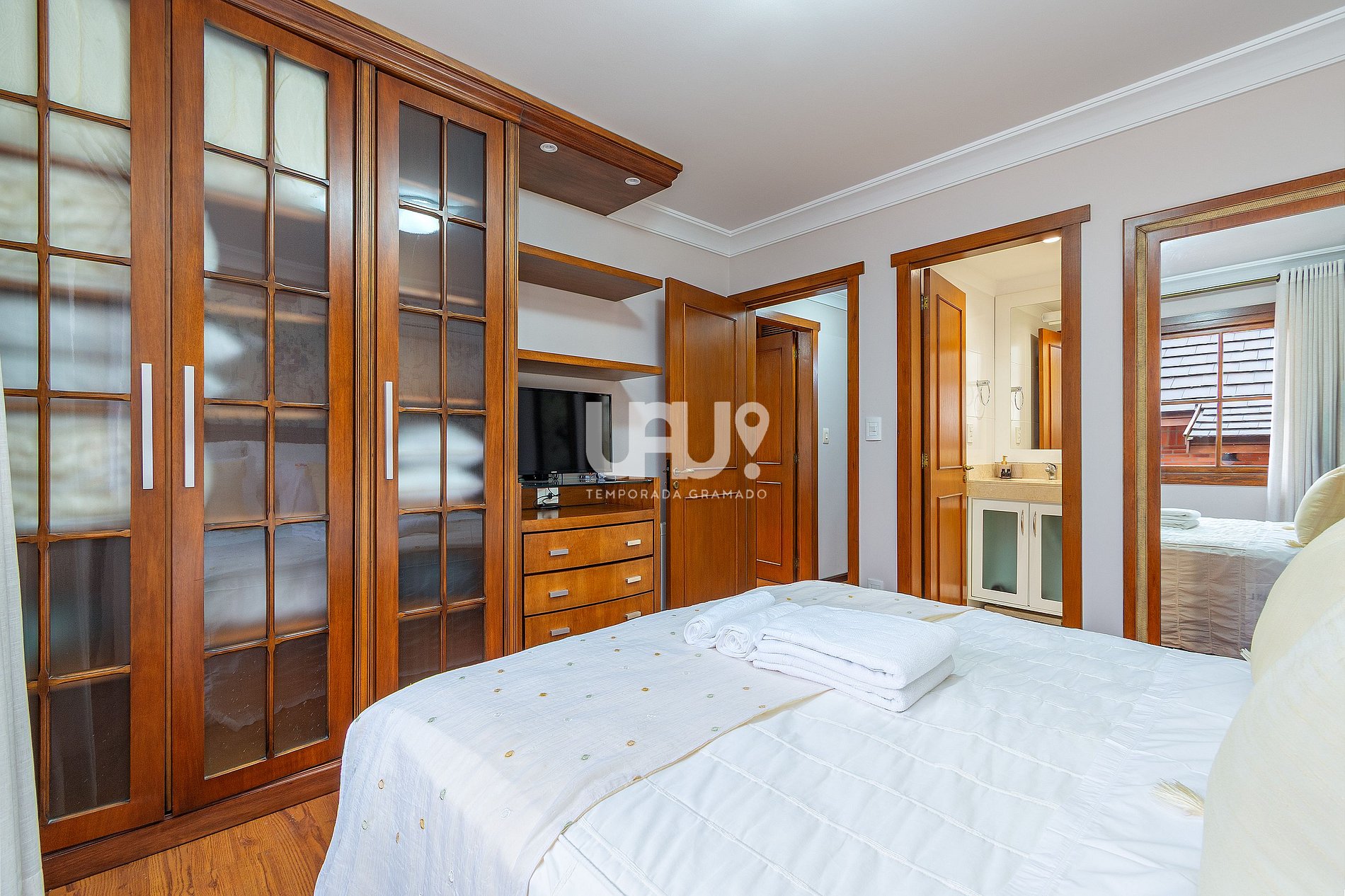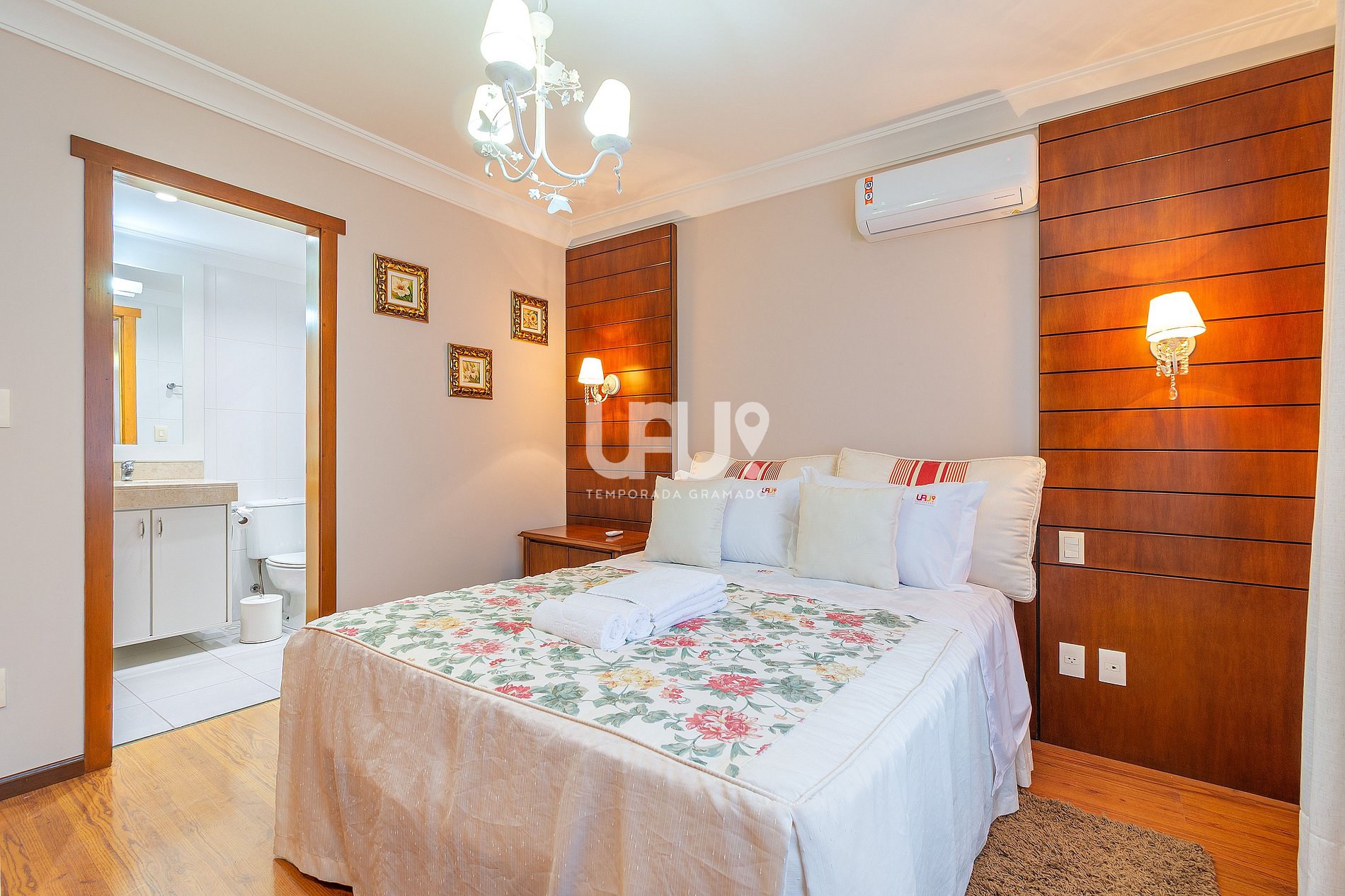 Desse modo, oferecemos acomodações confortáveis para até 16 pessoas, distribuídas em quatro confortáveis suítes, sala de estar em dois ambientes, com lareira, ar condicionado quente e frio e SmartTV 50', varanda com vista para o centro da cidade, sala de jantar para 12 pessoas, bancada alta próxima à churrasqueira, SmartTV 50', ar condicionado quente e frio, anexa à cozinha totalmente equipada, inclusive com churrasqueira a carvão.